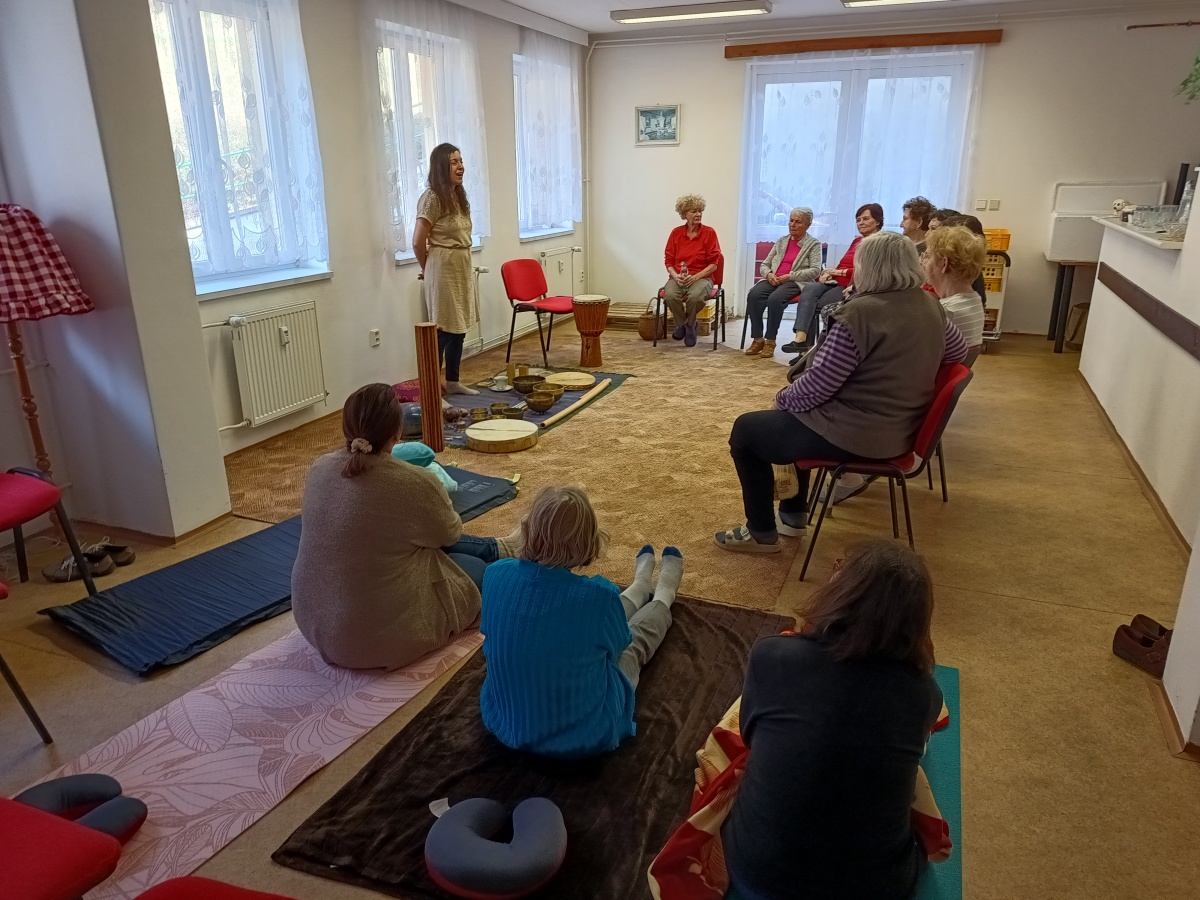 Během dopoledního setkání měli senioři možnost na chvíli zpomalit a zaposlouchat se do harmonizujících tónů tibetských mís, šamanského bubnu, fléten a dalších netradičních nástrojů. Jemné vibrace a zvuky pomohly navodit atmosféru klidu, soustředění a vnitřní pohody.