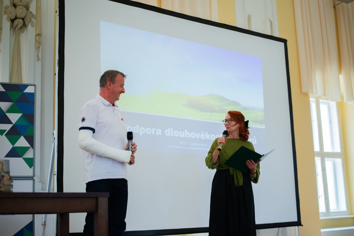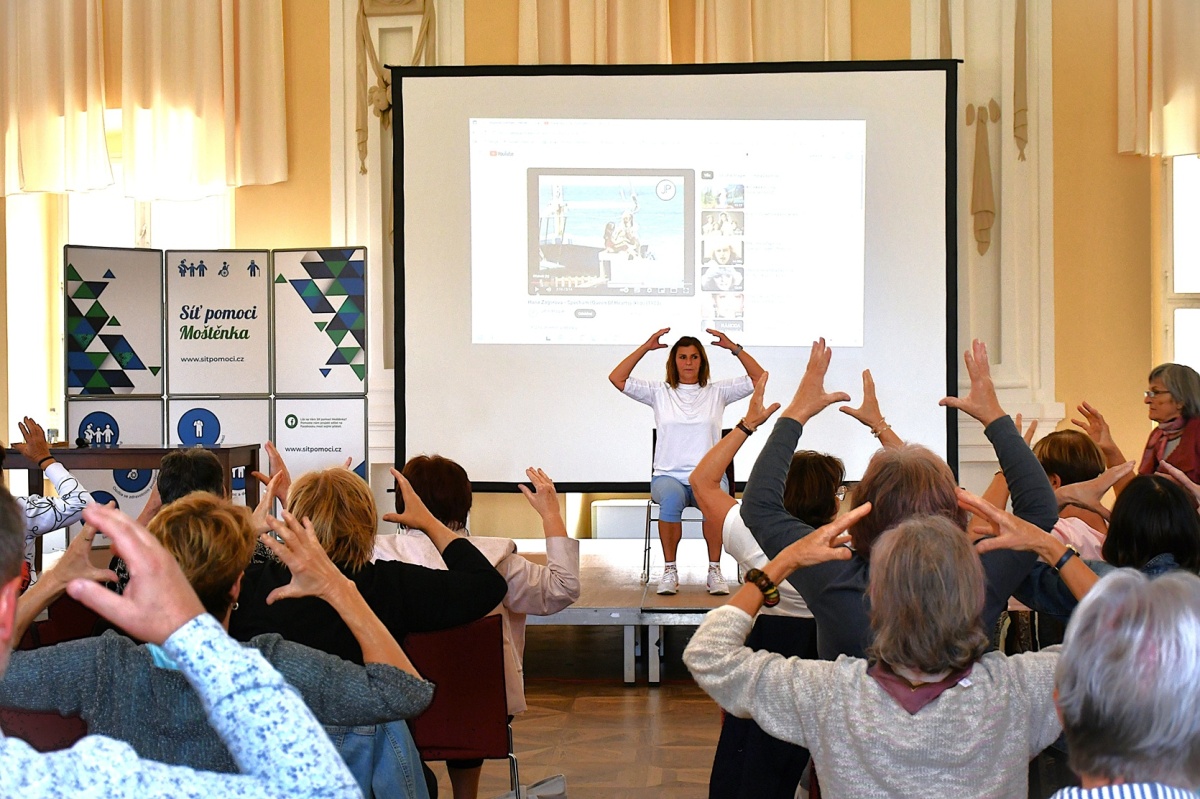 Že lze cvičit a také tančit i při sezení na židli či vedle ní, předvedla Jana Jiroušová, která přímo z pódia rozpohybovala přítomné, aby se poté mohli opět soustředit na přednášku laskavé psychoterapeutky Marty Kocvrlichové z Náměště na Hané. Ta se ve své praxi zaměřuje na individuální přístup k dospělým lidem. I pro ni je vždy primární konkrétní příběh konkrétního člověka ve všech kontextech jeho života. V MAS není žádným nováčkem, v minulosti zde několikrát přednášela neformálně pečujícím. Tentokrát vedla posluchače přes příběhy pohádek k zamyšlení nad tím, co je v životě skutečně důležité bez ohledu na to, kolik je nám let.