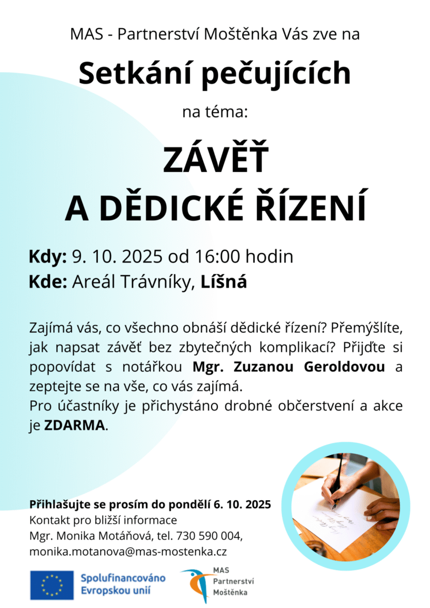 Setkáním Vás provede notářka Mgr. Zuzana Geroldová, která přiblíží, co všechno obnáší dědické řízení a jak napsat závěť bez zbytečných komplikací. Budete mít možnost zeptat se na vše, co Vás zajímá.